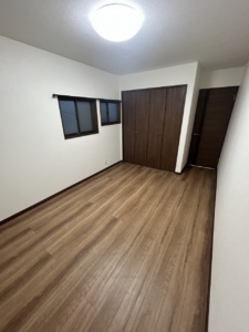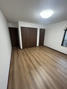 広い主寝室の既存の玄関扉は塞がず残し、物置として活用できるように手前側に新設の扉を付けました。