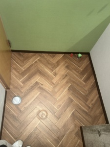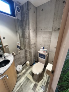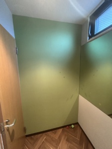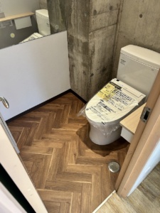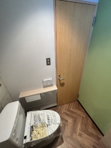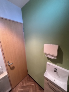 お客様へのご提案トイレは床の下地が劣化し傷んでいるため補修をおこないました。 トイレ本体は節水型をお選びいただき、手洗い器も薄型へ新しく取替えました。 壁紙もモスグリーンのカラーがアクセントになり落ち着いた雰囲気のレストルームに変わりました。