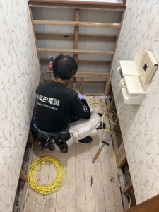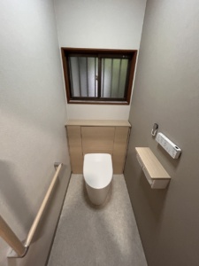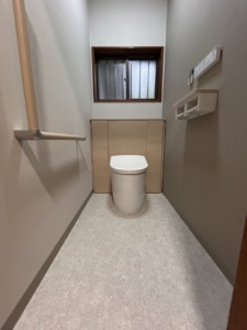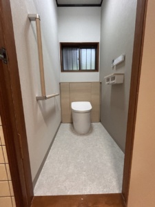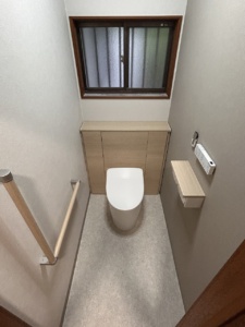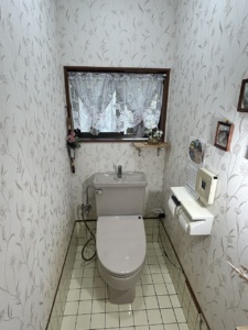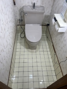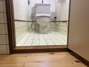 トイレ施工 ①既存器具類撤去 ②床・タイル撤去 ③給水管立ち上げ及び振り直し ④床及び部分壁下地造作及び合板貼り ⑤床クッションフロア貼り ⑥天井・壁クロス貼り ⑦巾木取付け ⑧器具設置及び繋ぎ込み